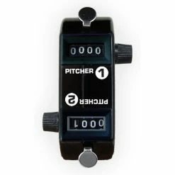 This pitch counter has a durable black case with reset knob and finger loop. Track home and visitor pitchers simultaneously. Counts from 0 to 9999.